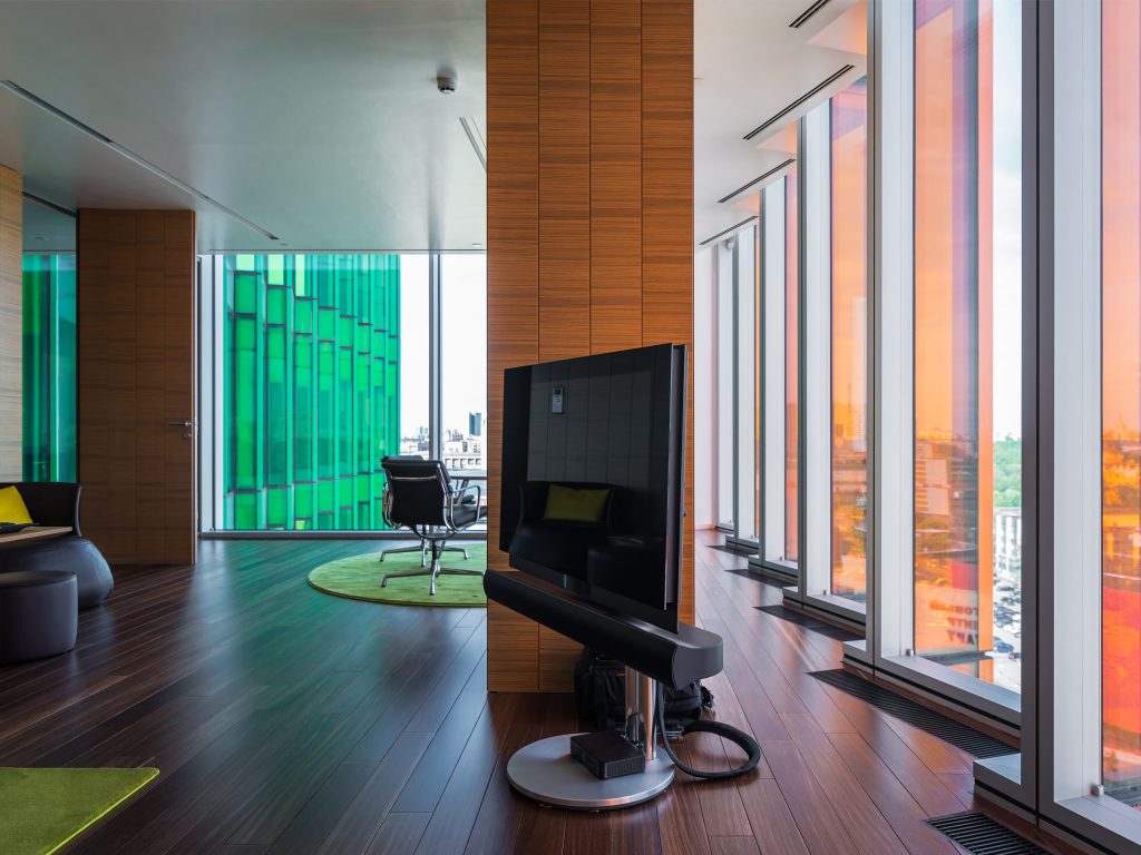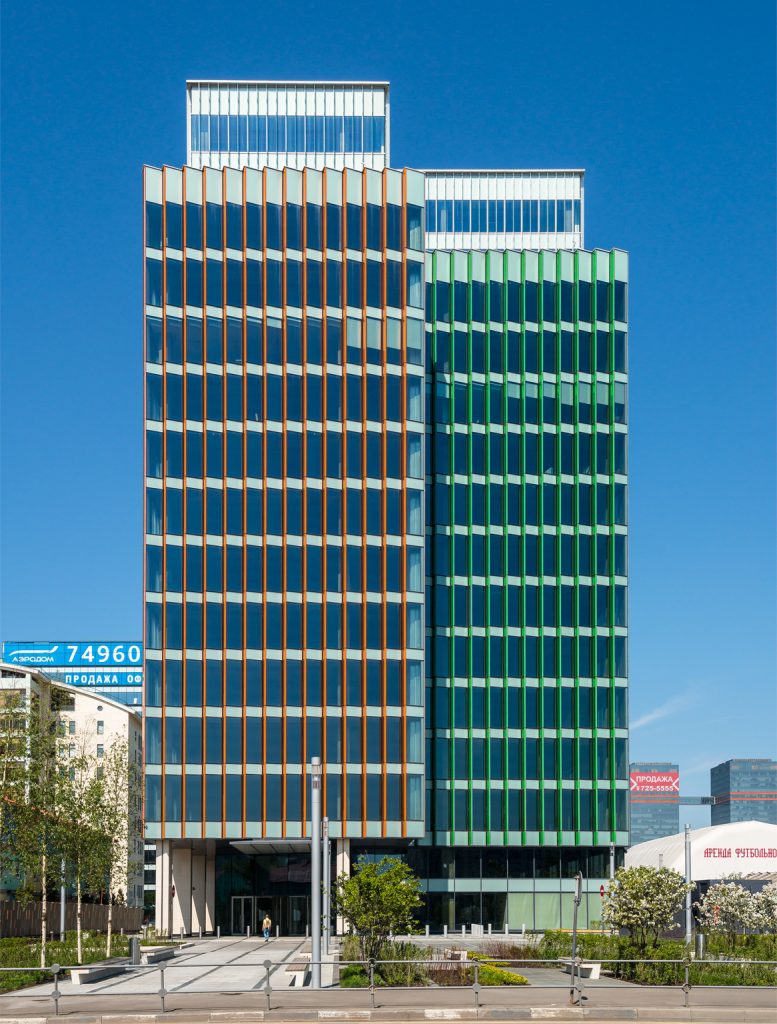 This award-winning fifteen storey office tower in north west Moscow was designed for a client specifically seeking international design excellence. Due to its prominent location and good access, this site represents one of the best business park opportunities in Moscow. The building has a staggered main façade incorporating coloured glass and lighting creating drama and excellent views over Moscow.