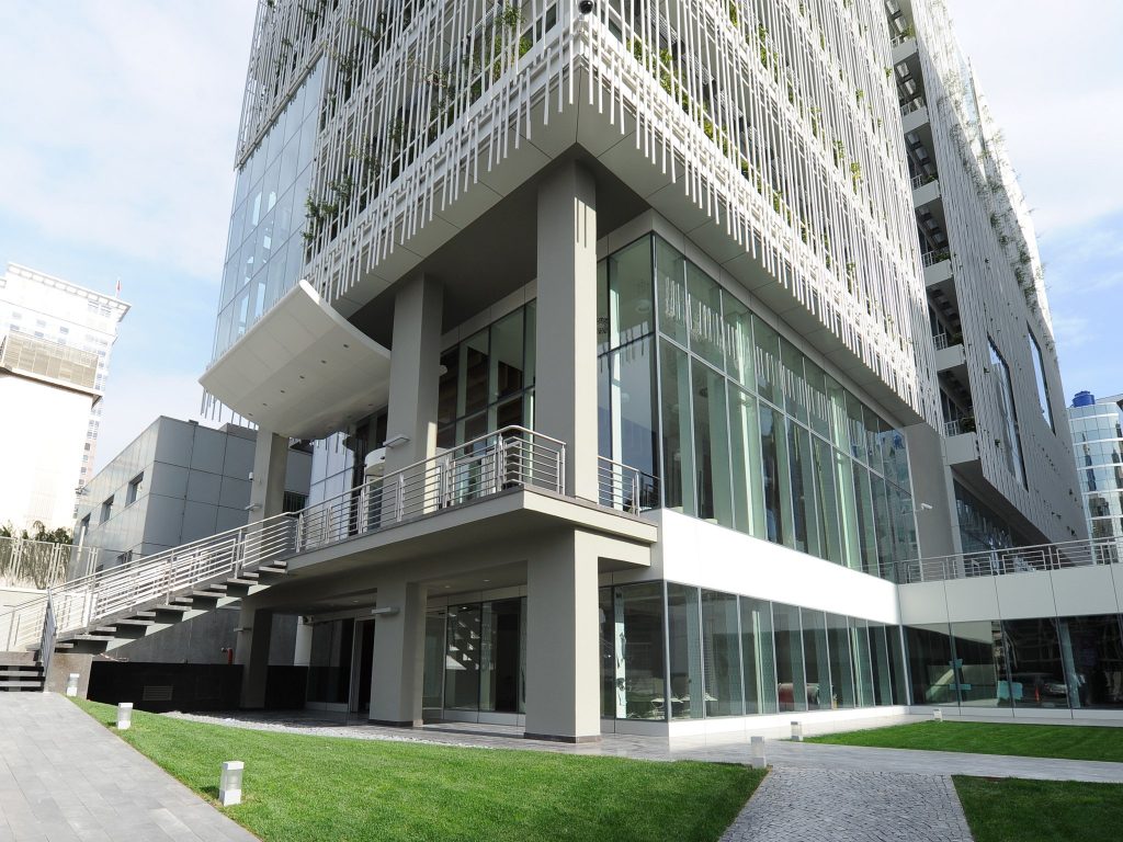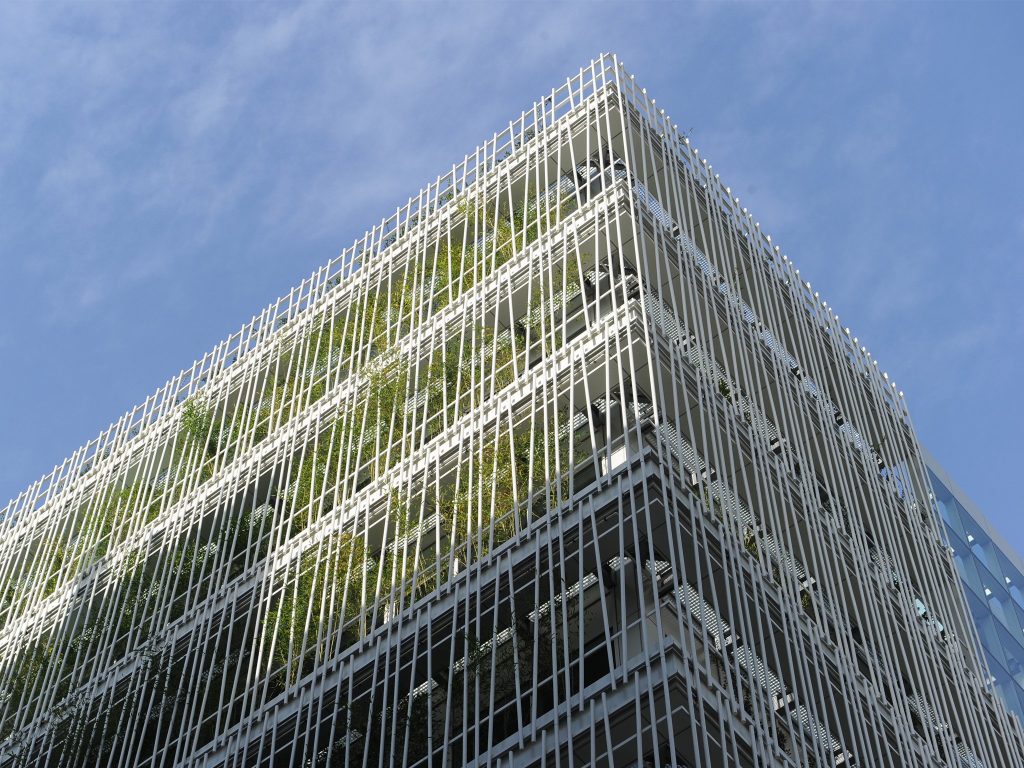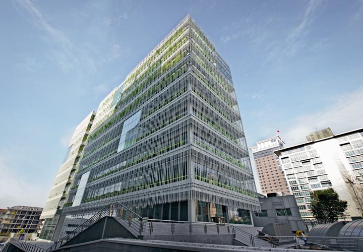 We collaborated with the Molestina Architects from Germany who designed the concept, we provided local services at all stages of the project from concept to completion. Our client sought a literal expression of the sustainability objectives for the scheme, so the external screen of aluminium poles provides an initial solar shading device. A landscaped zone on all the facades reinforces the man-made screen.