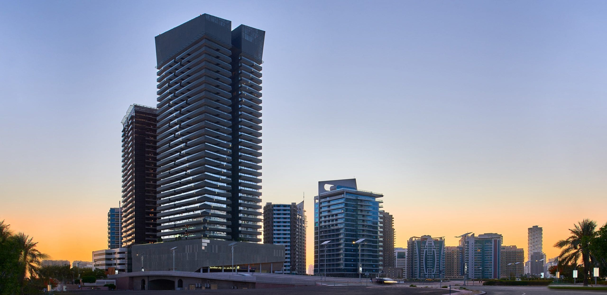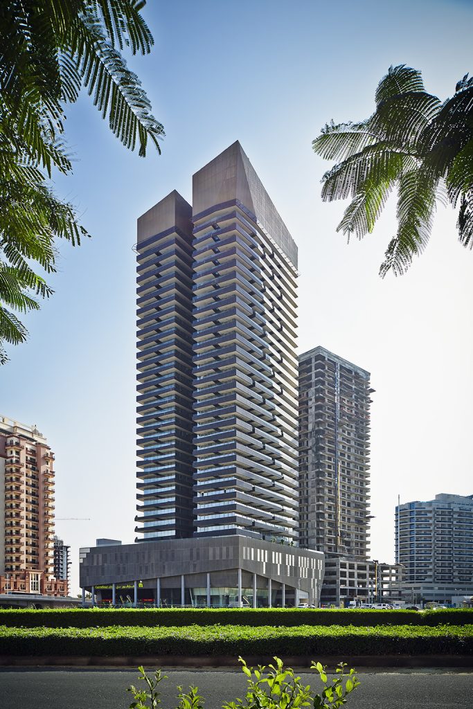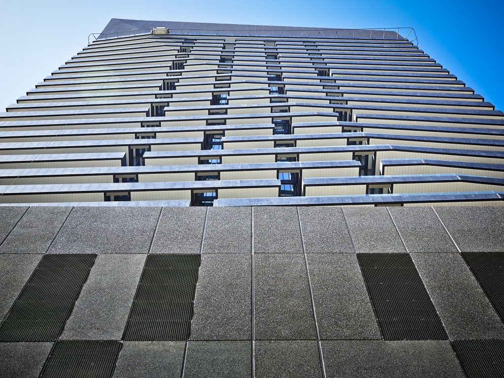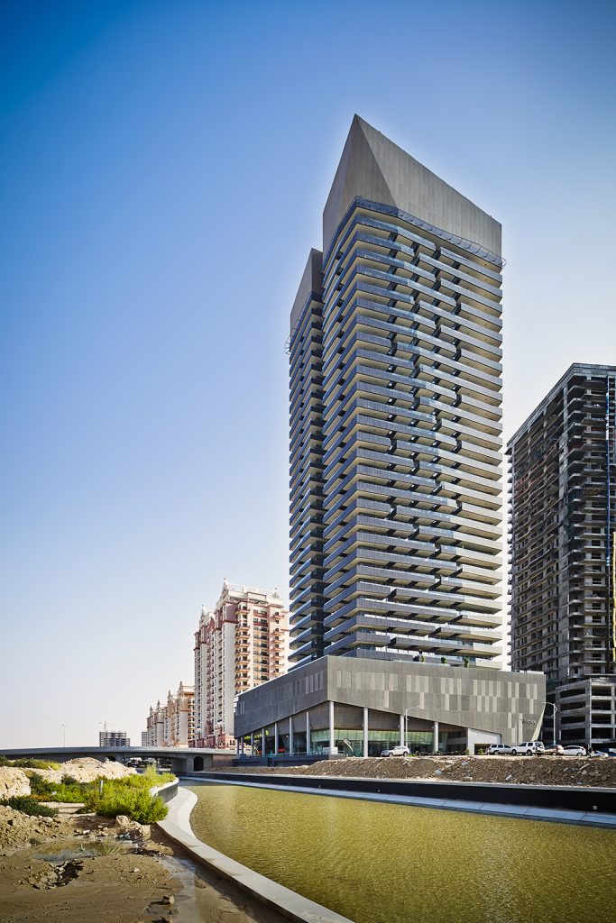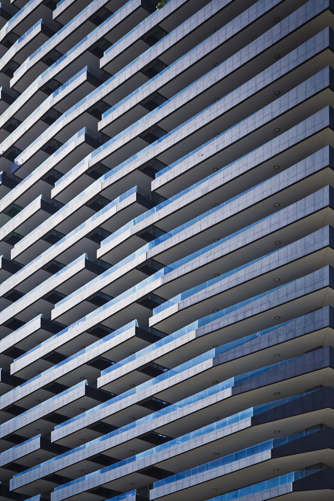 The design of this 34 storey tower is a response to its location along the canal. The podium form responds to this context by a splayed or ‘splash’ of glazed façade. This ‘splash’ effect is then generates a ‘ripple’ through the design of the balconies and accentuated to spectacular effect through the lighting design. Thermal efficiency has been optimized by low-E glass and overhanging balconies.